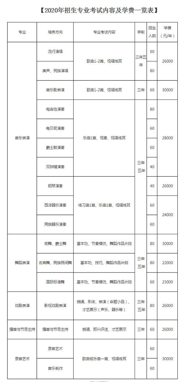 学校的教学结构由声乐教学部、器乐教学部、影视教学部、舞蹈教学部、流行舞教研室、国标舞教研室、音乐剧教研室以及专业基础课教研室和文化课教研室等九个教学部组成。开设声乐、音乐剧表演、器乐、舞蹈、流行舞、国标舞、影视表演、录音艺术、音乐制作等专业。