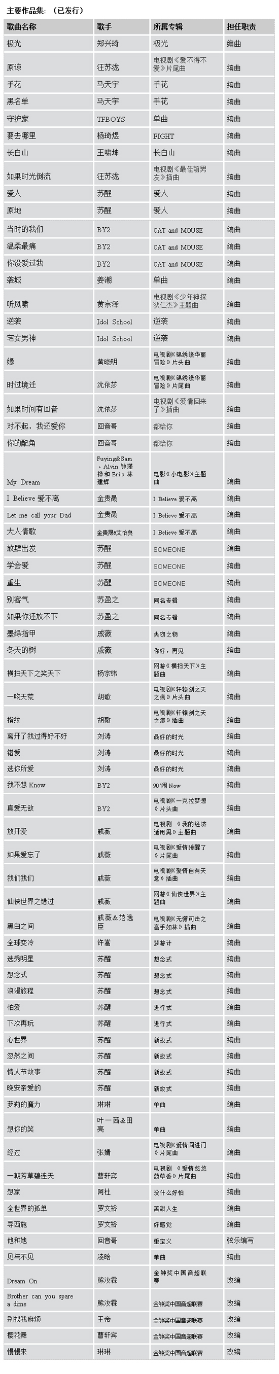 歌曲:《极光》《手花》《黑名单》《守护家》《爱人》《原地》《当时的我们》《温柔最痛》《你没爱过我》《袭城》《逆袭》《宅女男神》《对不起,我还爱你》《你的配角》《放肆出发》《重生》《冬天的树》《墨绿指甲》《错爱》《大人情歌》《下次再玩》等