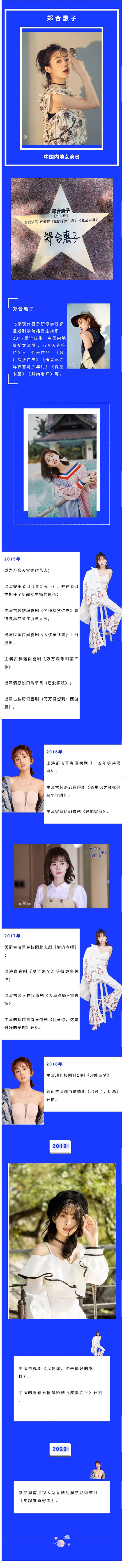 郑合惠子,北京现代音乐研修学院影视戏剧学院播音主持系2017届毕业生,中国内地影视女演员 、万合天宜签约艺人。参与拍摄影视剧《名侦探狄仁杰》《奇星记之鲜衣怒马少年时》《夏至未至》《鲜肉老师》《霍去病》《超能造梦》《立秋》等。