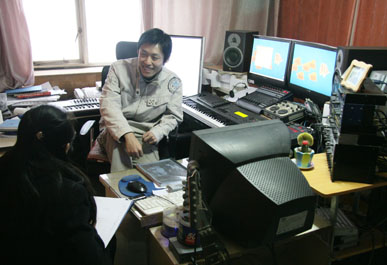 郝一刚1999年来北京,至今已经10年了,十年前他就抱着非常明确的目标来北音求学,那就是做一名专业的“配乐”音乐人,“我从最早确立最终目标后就没有偏离过,十年前立志做配乐,十年后还在这个领域努力探索提高。”为了这个目标,在北音学习的两年,他学遍了和音乐相关的所有课程,只要是音乐制作系没课,他就跑到录音艺术系、流行演唱系(学院)和爵士乐系(学院)去蹭课,“我去录音系学录音和混音,因为这对音乐的品质有直接的影响,我去流行演唱系学发声方法,因为我将来一定会监唱,就会涉及到与歌手专业的术语沟通,我去爵士乐系学爵士钢琴,因为搞作曲不学美国本土音乐是不够的,现在我还在家里读伯克利音乐学院的自学教材。