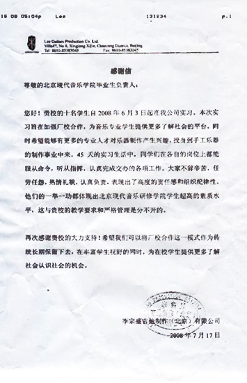 2008年7月17日,北京现代音乐学院收到李宗盛吉他公司的感谢信,感谢我院十名实习生在公司做出的贡献。