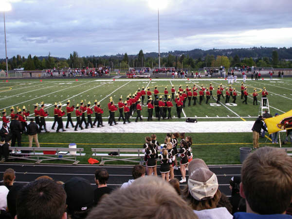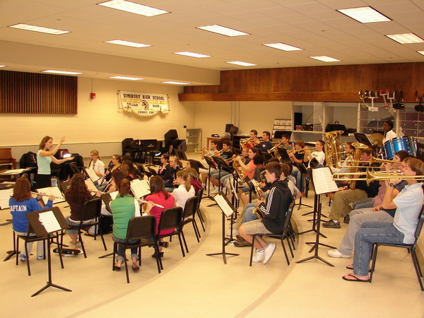 (美国中学里,一年一度的管乐比赛如期举办,每一个班级都有一个管乐团,而中国,一个城市都没有一个)