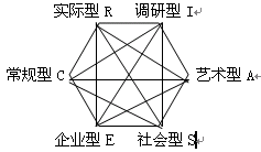 霍兰德所划分的六大类型,并非是并列的、有着明晰的边界的。他以六边形标示出六大类型的关系,如下图所示: