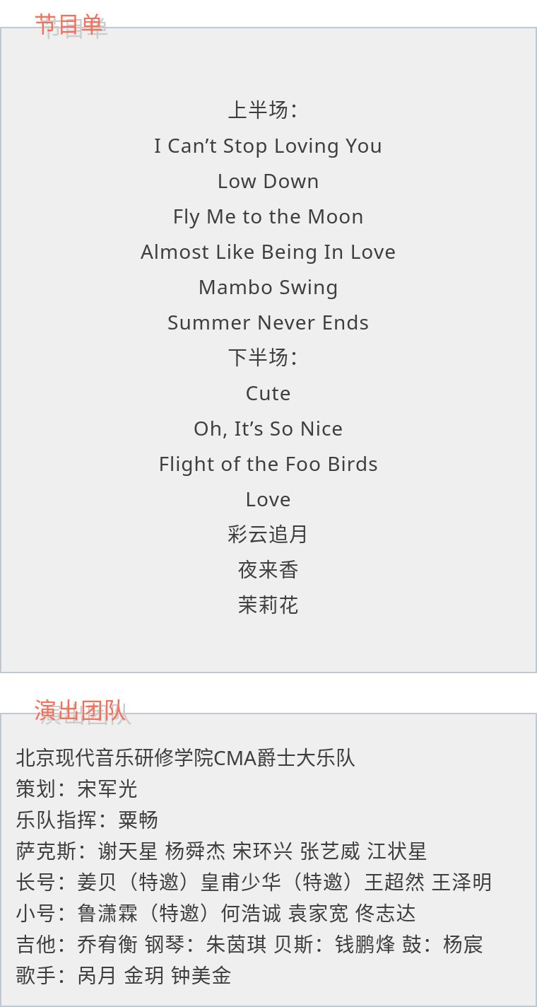 利用乐曲间隙时间,乐队指挥粟畅博士为现场观众讲解爵士乐的文化、历史,让观众在享受音乐的同时,对爵士乐、对音乐有了进一步的了解。粟畅介绍到,新一代中国爵士音乐人志在用爵士乐作为载体来推广、宣传中国文化,北音CMA爵士大乐队和美国北科罗拉多大学爵士乐教授们合作创作的“中国民歌遇见爵士大乐队”项目,将中国传统民歌改编为爵士大乐队演奏,正是北音在这个方向上的大胆探索,大乐队现场演奏了该项目中的《夜来香》《茉莉花》《彩虹追月》三首作品,为祖国母亲生日献礼。