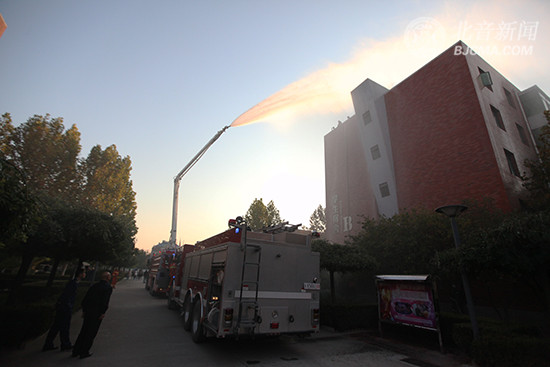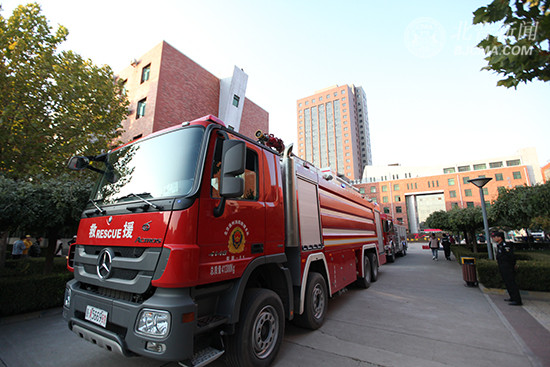 16:10,烟雾点燃,警报声随之响彻校园,梨园消防中队出动三辆消防车,一辆高空作业车,10名消防员,在宿舍楼高层进行高空灭火演示,全体师生有序撤离……