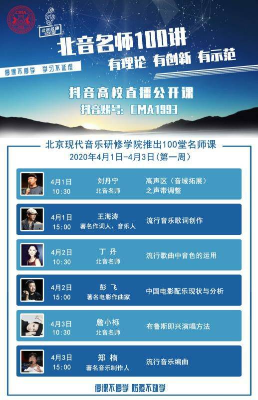 北京现代音乐研修学院整合北音名师及社会行业专家翘楚等强大教师资源及高水准专业课程资源,将于4月1日起在北音官方抖音(抖音账号:CMA1993)推出100堂名师课——《北音名师100讲》,在延期返校期间,于每周一至周五上午10:30 下午15:00 开讲,课程内容涉及流行演唱、美声、爵士演唱、爵士乐演奏、乐队演奏、民族器乐、音乐制作、音乐录音、古典舞、拉丁舞、影视表演、播音主持等多个专业,有创新、有理论、有示范,你想学的课上都有!一起关注,学起来!