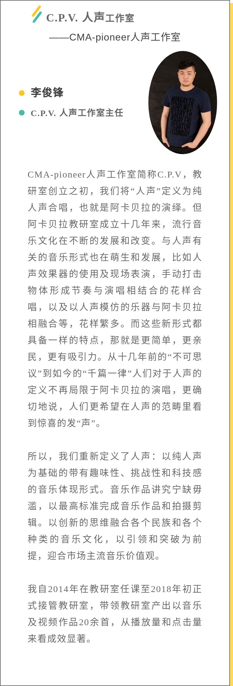 早在2001年,北京现代音乐研修学院流行演唱学院就已开设阿卡贝拉这一特色教学,并创办组合演唱专业学科、成立组合教研室,编写了众多适用于阿卡贝拉及组合演唱的相关教材,并在阿卡贝拉及组合教学方面有了学院特有的教学方式,这为我国现代音乐专业教育填补了空白。阿卡贝拉,一直是北音流行演唱学院的特色及优势之一,曾获得过国内外无数殊荣,成为了国内权威的阿卡贝拉产业的引领者。2014年,阿卡贝拉教研室改革更名为C.P.V人声工作室(CMA-pioneer人声工作室),致力于开发所有与纯人声有关的演唱方式,将其制作成优质成品并推广出去。