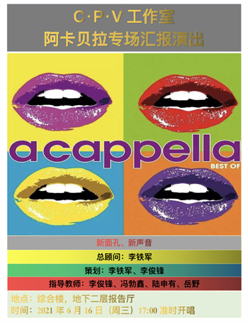 近日,北京现代音乐研修学院C.P.V工作室阿卡贝拉专场汇报演出在地下报告厅精彩开唱,声海无伴奏合唱团、8:30不准时、战斗机合唱乐团、bigbabol人声乐团、Channel 5组合以及C.P.V工作室师生团带来《in the still off the night 》、《看月亮爬上来》、《down》、《北京一夜》、《龙的传人》、《王妃》、《butter fly》、《Havana》《attention》、《万物生》、《talk dirty》一系列阿卡贝拉音乐作品,以极具魅力的嗓音和富有感染力的表演,带领大家沉浸在“阿卡贝拉”的人声天籁中。