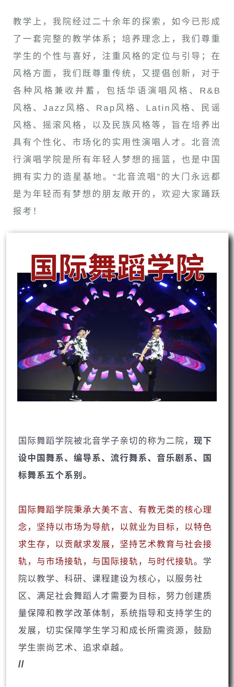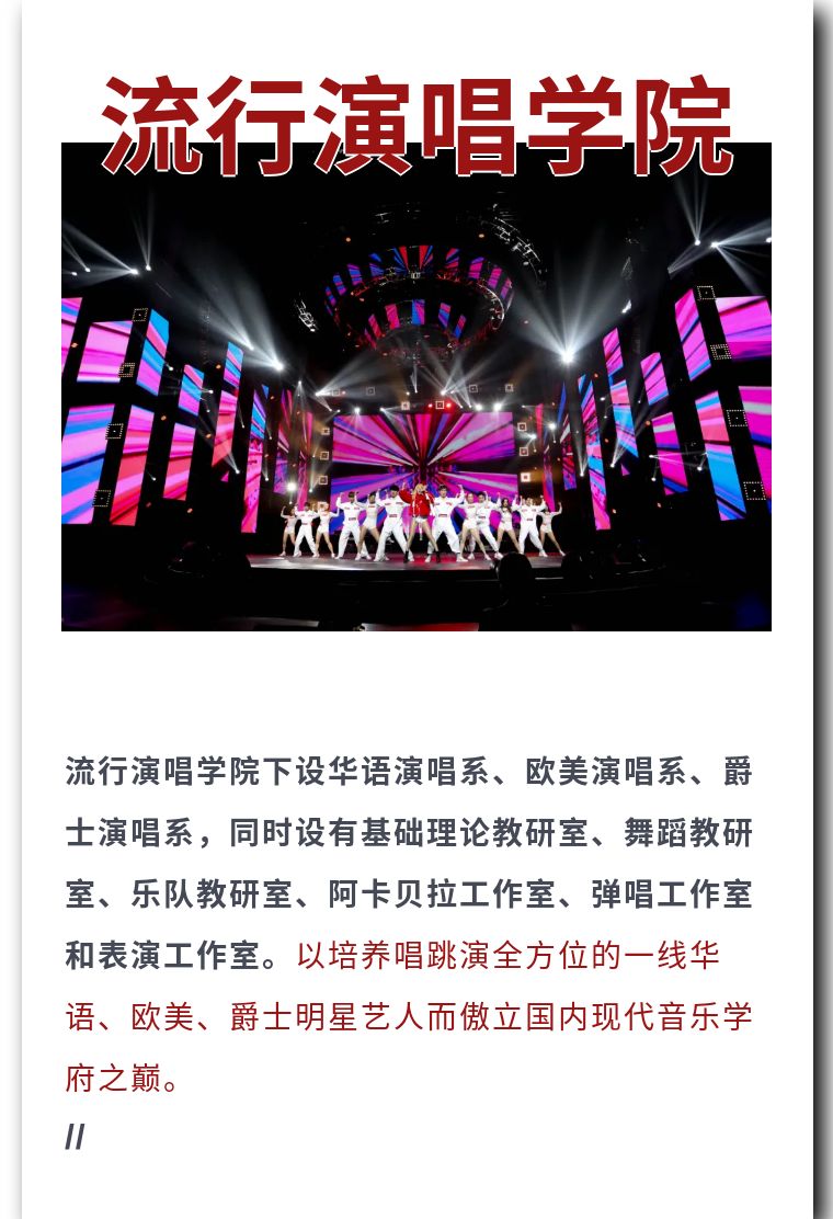 3、以打造“国际化、前瞻性、市场化”的歌手艺人作为教学培养目标,让每一位学生通过四年的学习,成为集唱、跳、演于一体,具有一专多能,与当下文化市场接轨的“多元型、复合型”流行演唱人才;