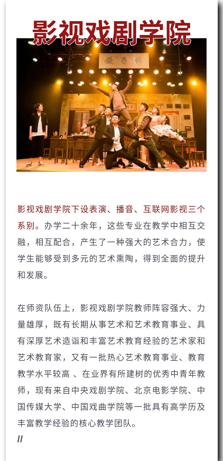 目前,学院拥有6大个专业学科50个专业培养方向、600余名教职员工、5000余名在校学生。近10年来,我院学生在《快乐女声》《快乐男声》《中国好声音》《中国好歌曲》《中国好舞蹈》《中国有嘻哈》《创造101》《偶像练习生》《青春有你》《这!就是街舞》《这!就是原创》《中国新说唱》《乐队的夏天》等大型选秀活动中,摘金夺银,取得了骄人的业绩。